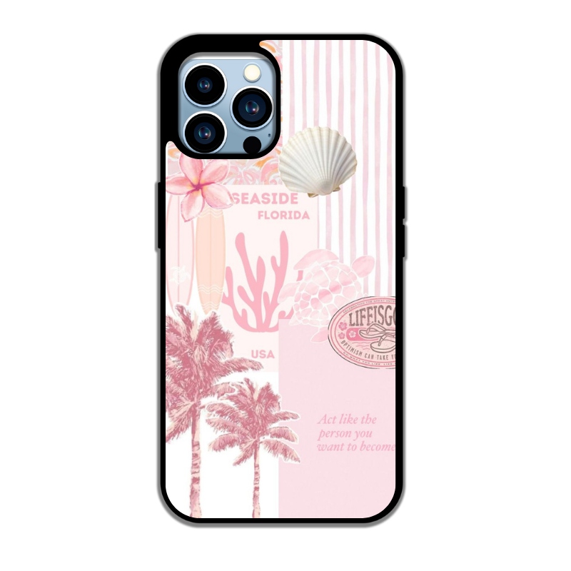 Entre rayures pastel, coquillage nacré et palmiers roses, cette coque te fait voyager dès le premier regard ! L’inscription “Act like the person you want to become” ajoute une dose d’inspiration à ton quotidien 🌞