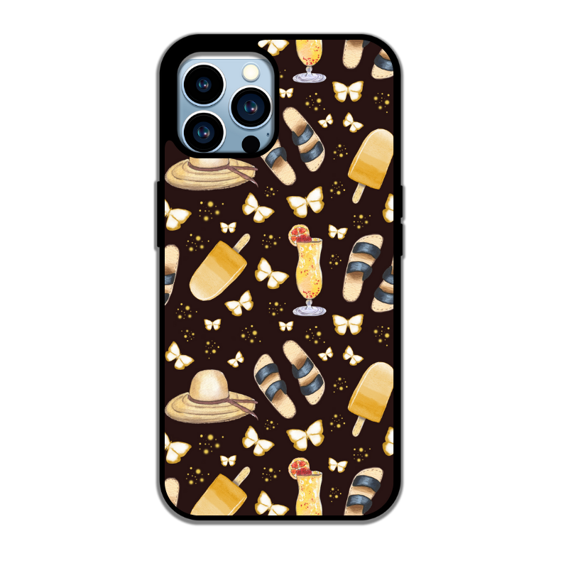 Plonge dans une ambiance chic et sucrée avec cette coque au fond noir profond, parsemée de glaces, de papillons et de petits accessoires d’été dorés.