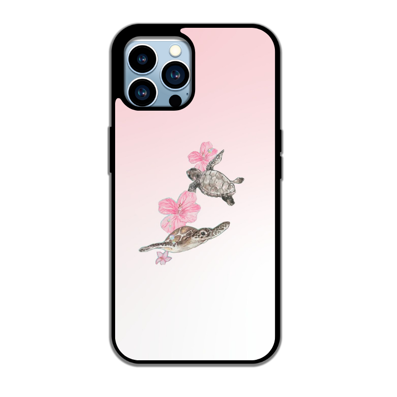 Deux petites tortues en balade, portées par des fleurs tropicales sur un fond rose tendre 🌸🌊
