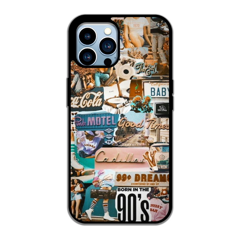 Un collage fun et coloré de publicités, objets cultes et icônes des années 90 : roller, Coca-Cola, cassette, Cadillac, et plus encore. Une vraie dose de nostalgie pour tous les amoureux de cette époque mythique.