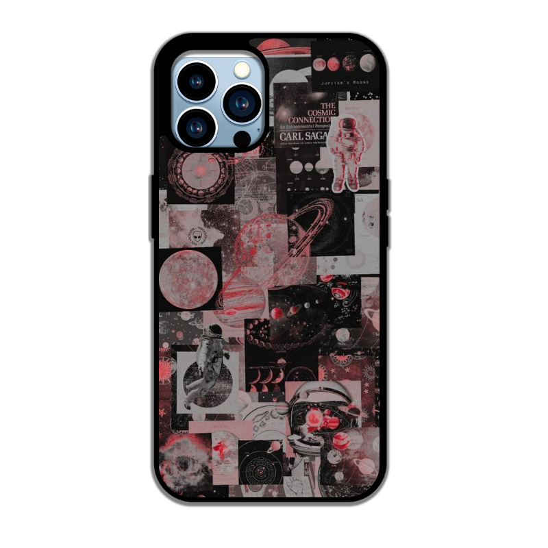 Un patchwork cosmique mêlant astronautes, planètes, orbites et extraits de textes scientifiques dans une palette noir, rose et rouge. Cette coque rend hommage à l’univers, entre science, art et fascination céleste.