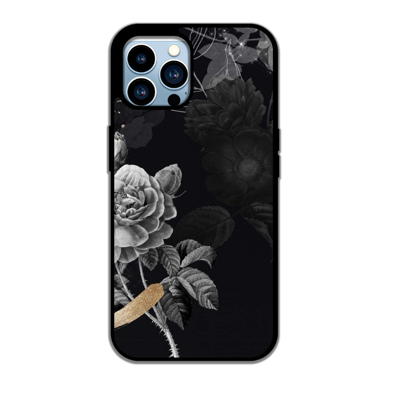 Des fleurs finement dessinées dans des tons monochromes, sur un fond noir profond. Un contraste sophistiqué, rehaussé de touches dorées, qui évoque un jardin nocturne, intime et raffiné.